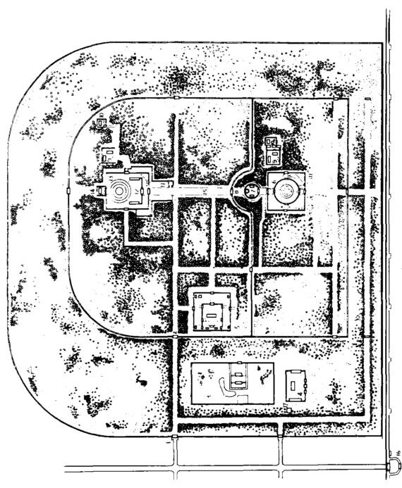 1.坛西门 2.西天门 3.神乐署 4.牺牲所 5.斋宫 6.圜丘 7.皇穹宇 8.成贞门 9.神厨神库 10.宰牲亭 11.具服台 12.祈年门 13.祈年殿 14.皇乾殿 15.月陛桥 16.永定门 17.钟楼图19 北京天坛平面图 (选自《中国古代建筑史》)