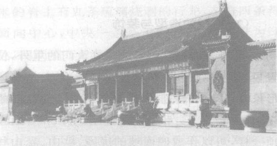 第三种是设立在大门两侧的影壁。影壁除了具有屏障的作用外,还同时具有装饰的作用,故有时在大门两侧设立影壁以起到增加入口气势的作用。紫禁城内廷部分的大门乾清门,它的规模自然不能超过外朝部分大门太和门,所以在开间多少,屋顶形式,台基高低等各方面都要低于太和门,但它又要保持相当的气势,所以在门的两边各立一座影壁,成八字形列于左右并与大门组成为一个整体(图34)。在紫禁城的斋宫大门,养心门,御花园的天一门两边都加设了这种影壁,但是这种影壁已经不是独立存在而是与大门联在一起成为大门不可分割的一部分了。