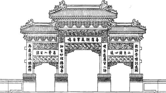 如果按小品建筑在建筑群中所处的位置来讲,人们最先能见到的应该是牌楼。它通常立在重要建筑群的前沿,或者在通衢大道之上,十分引人注目。我们去游览北京颐和园,最先见到的是一座木牌楼,走进牌楼才到达颐和园的东宫门;而到北京明代十三陵,首先看到的也是一座很大的石牌楼,它是明代十三座皇陵的总入口,经过牌楼后才进入了陵区;在过去老北京的前门大街和东西长安街上都立有木牌楼作为进入皇城的标志;在北京东城、西城的商业街中心十字马路口,原来立着四座牌楼,所以老北京人都将这个地方称为东四牌楼和西四牌楼。后来由于城市的发展,马路加宽,这几座牌楼因为阻碍交通而被拆除,但北京人仍习惯地称该地区为东四与西四,可见牌楼影响之大了。牌楼有哪几种形式,有哪些功能,在形象和艺术上又有些什么特点,这些都是十分有趣的问题。
