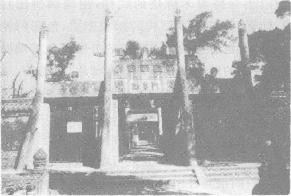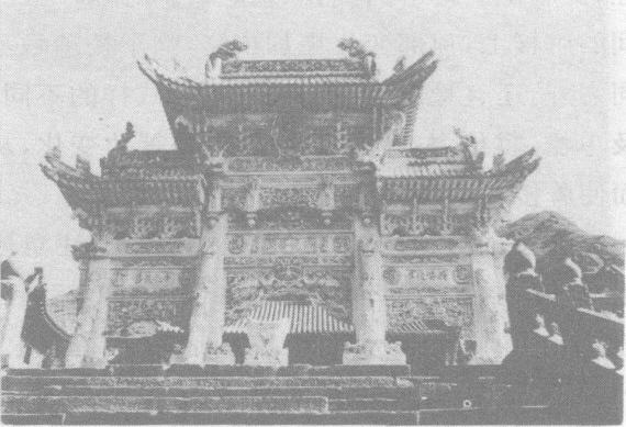 现在再从牌楼的不同功用中看它的分类。第一种是标志性的牌楼,它们多设置在宫殿、寺庙、陵墓等建筑群的前面,作为这组建筑的一个标志,所以多立于建筑群主要大门的正前方,如果道路是横穿大门前面,则在大路的左右各立一牌楼,沈阳故宫大清门前马路的两边就立着两座木牌楼作为故宫范围的标志。第二种是纪念性牌楼。古代为了纪念一件事或者某个人,往往在当地建立牌楼,将人名及其事迹刻在牌楼上以资纪念。安徽歙〔she射〕县中心有一座“许国牌坊”,建于明万历十二年(公元1584年),这是纪念当地人许国的,他中了进士后,当了 20多年的官,并且在云南打仗立了战功,被晋升为武英殿大学士,为了表彰他的功绩,在其家乡树立了牌楼。四川云阳县有一座石牌楼,是纪念当地一位妇女的,她17岁嫁人,28岁死了丈夫,独自侍奉公婆,并将子女抚养成人,被誉为节 孝双全,为此专门立了牌楼并将她的事迹刻于牌楼正中的华板上。类似这种宣扬效忠朝廷,节孝双全的纪念性牌楼在全国各地为数甚多,在歙县唐樾〔yue月〕一个村里就一连立了七座之多,形成为一个牌楼系列。第三是大门式牌楼。前面讲到的标志性牌楼,由于它们处于建筑群的最前面,故也起到大门的作用,但它们是独立地存在,柱子中间也不安门扇,所以还不能称为真正的大门。现在讲的大门式牌楼是真正属于建筑群的一种院门,它们左右连着围墙,柱间有门扇,只不过又具有牌楼的形式。颐和园内的仁寿门,山东曲阜孔庙的棂星门都属这种类型。在四川峨嵋山还可以见到用牌楼当作桥上门的,这种形式大大地加强了桥的表现力。第四种是装饰性的牌楼。这种形式在古代店铺上见得最多,它们既不是独立的标志,也不是大门,而是贴在店铺门脸上的一种装饰。这种牌楼都在铺面前立柱,柱上横枋多高出店面屋顶,用冲天柱的形式,在牌楼上可以悬挂各种店铺的招牌(图31)。在南方一些地区的祠堂、寺庙的大门上,还可以见到一种牌楼式的门脸,大多用砖砌或粉刷造出牌楼的形式,贴在大门的左右和上方墙上,成为大门的一种装饰。